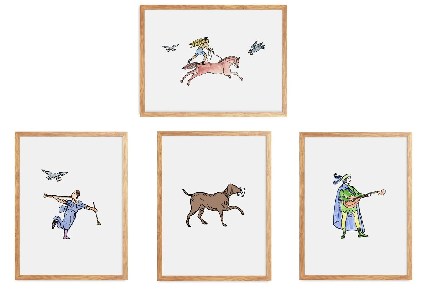 The theatrical characters are a good example. They belong to the same world — each one has a different personality, a different energy, but they share a hand, a palette, a sense of drama. Hung together, they don’t just decorate a wall. They tell a story. Separately, each one holds its own. But together, they become a cast.