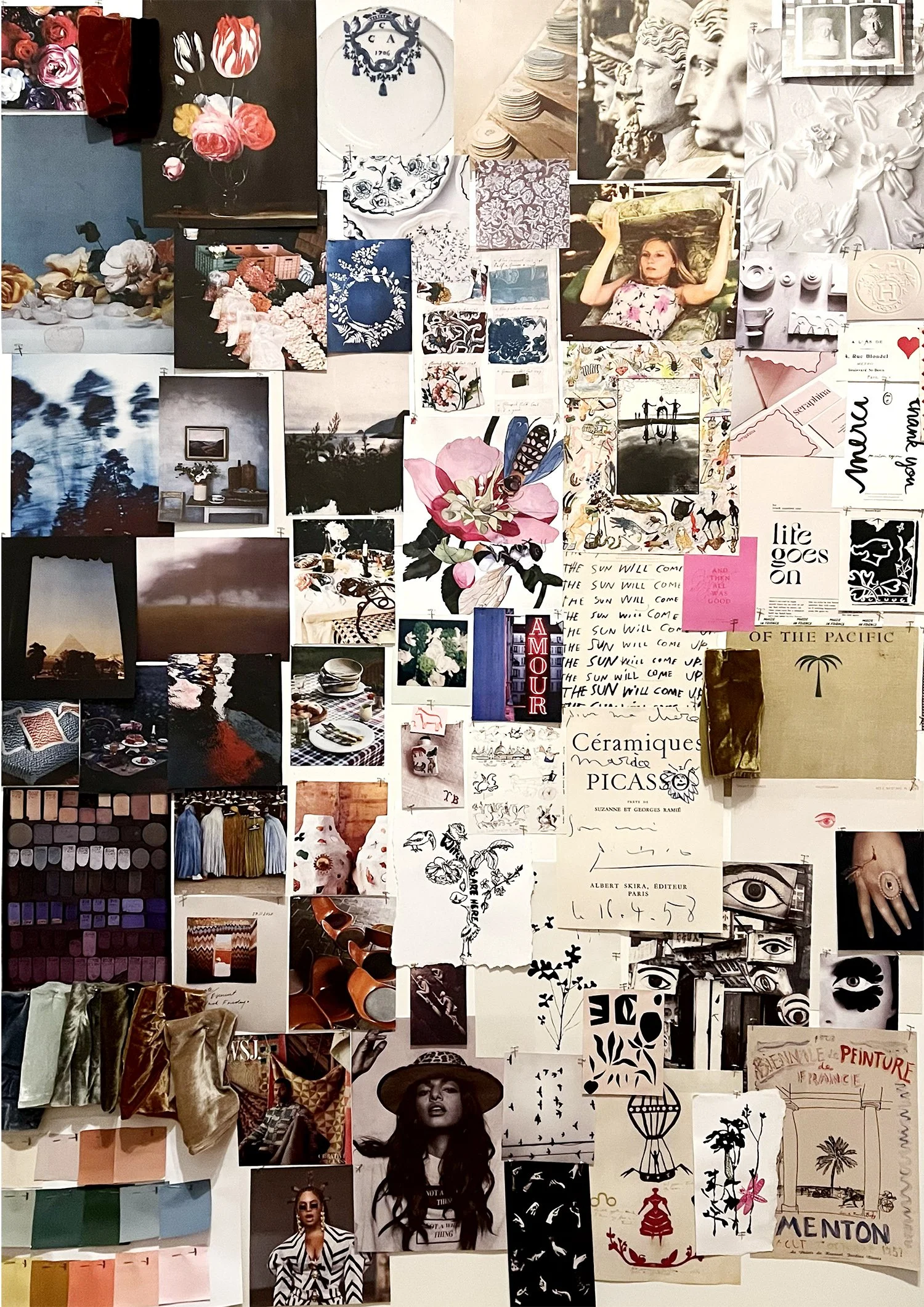 Mood Board I created for a project: mix of images from Art, Movies, Design, and fabrics, colors, sketches
